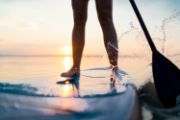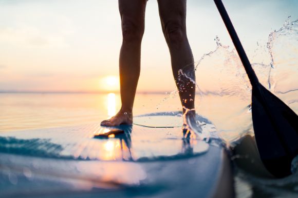A person's legs standing on a paddle board with their oar splashing water to move forward.