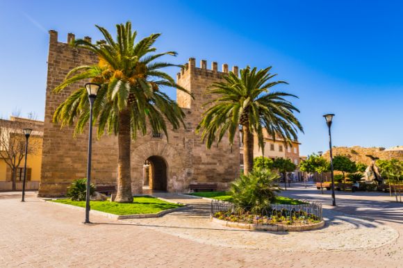 The view of the gate of a fortress wall outside the historic city center of Alcudia.