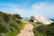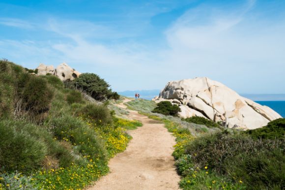 A dirt path on the coast of Sardinia surrounded by low-lying grasses, overlooking the water.