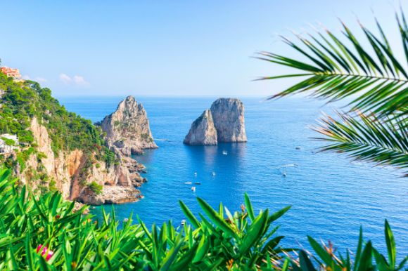The view of the Faraglioni cliffs off the coast of Capri with green foliage in the foreground.