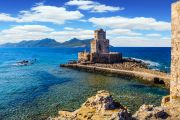 A three-tiered watchtower sits on a rocky peninsula overlooking the blue sea with green mountains in the background.