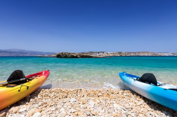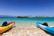 An orange and a blue kayak sit side by side on the edge of a rocky beach and clear blue waters.