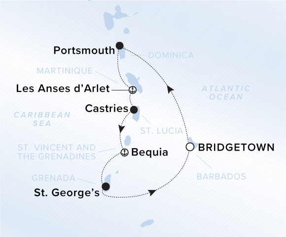 A map showing the Atlantic Ocean and Caribbean Sea. A line shows the voyage route from Bridgetown to Roseau, Les Anses d'Arlet, Castries, Bequia, St. George's and Bridgetown.