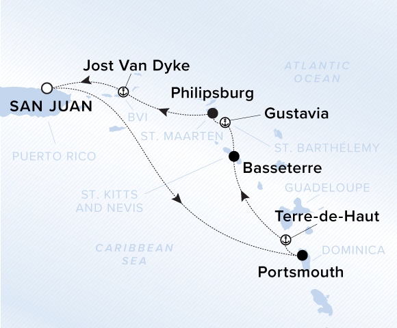 A map showing the Caribbean Sea. A line shows the voyage path from San Juan to Roseau, Terre-de-Haut, Basseterre, Gustavia, Philipsburg, Jost Van Dyke and back to San Juan.