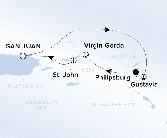 A map showing the Caribbean Sea. A line shows the voyage path from San Juan to Gustavia, Philipsburg, Virgin Gorda, St. John and back to San Juan.