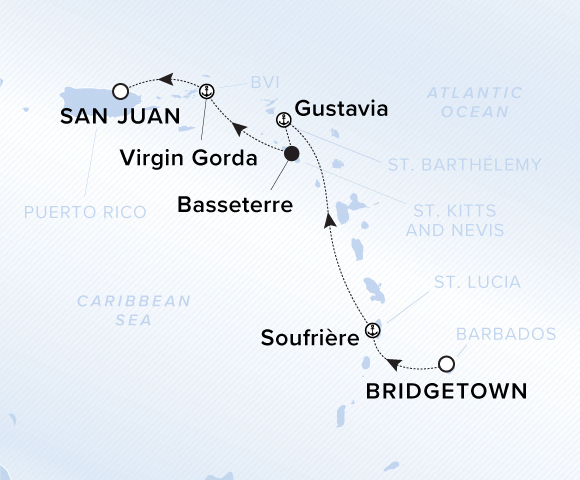 A map showing the Caribbean Sea. A line shows the voyage route from Bridgetown to Bequia, Mayreau, Willemstad, Kralendijk and Oranjestad.