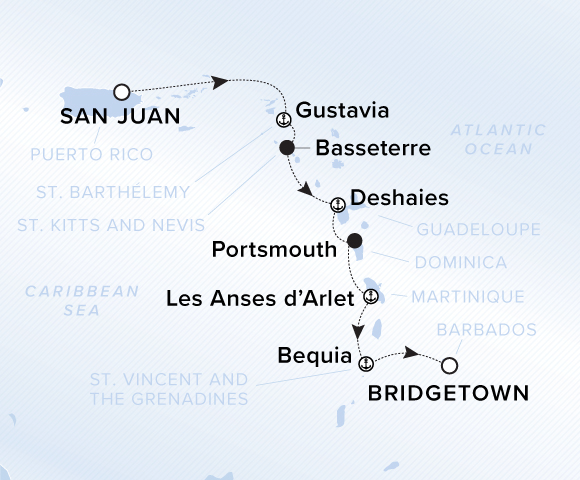 A map showing the Atlantic Ocean and Caribbean Sea. A line shows the voyage route from San Juan to Gustavia, Basseterre, Deshaies, Roseau, Les Anses d'Arlet, Bequia and Bridgetown.