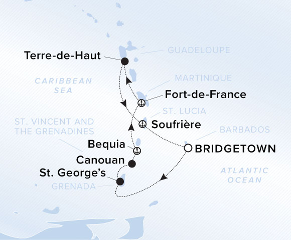 A map showing the Atlantic Ocean and Caribbean Sea. A line shows the voyage route from Bridgetown to Charlotteville, St. George's, Mayreau, Bequia, Fort-de-France, Soufrière and Bridgetown.