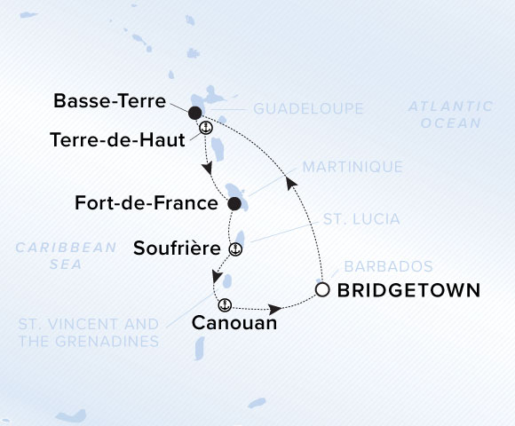 A map showing the Atlantic Ocean and Caribbean Sea. A line shows the voyage route from Bridgetown to Basse-Terre, Terre-de-Haut, Fort-de-France, Soufrière, Mayreau and Bridgetown.
