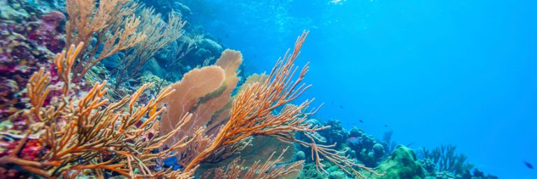 An underwater view of brightly colored coral and deep blue water.