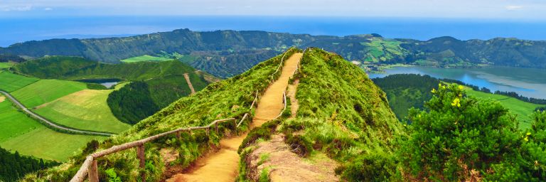 A dirt path winds along a lush green hillsides, with blue ocean in the background.