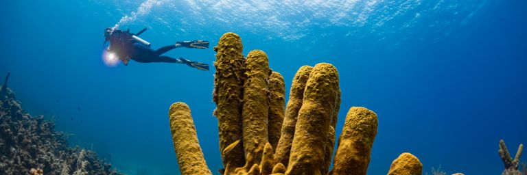 A scuba diver swims above yellow tube coral in the Caribbean Sea.
