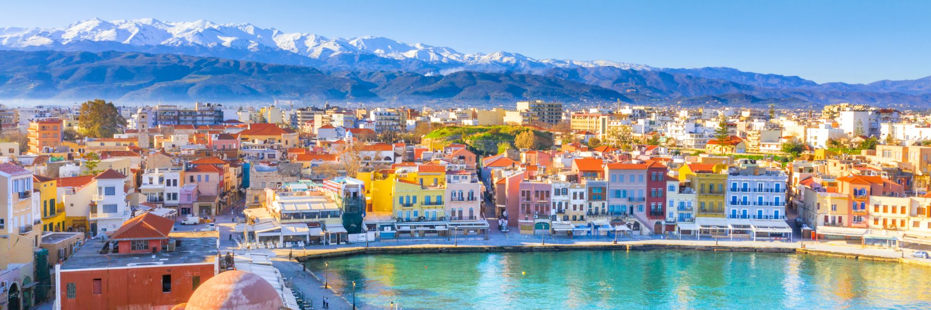 The Old Venetian Harbor of Chania, Crete, lined with shops and eateries.