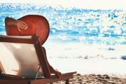 The rear view of a woman wearing a large straw hat and reclining on a sun lounger on the beach.