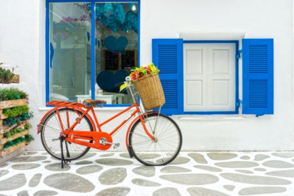 An orange bicycle with a basket of flowers parked in front of a whitewashed building with blue shutters.