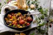 A skillet of caponata, a Sicilian dish of chopped fried aubergine and other vegetables.