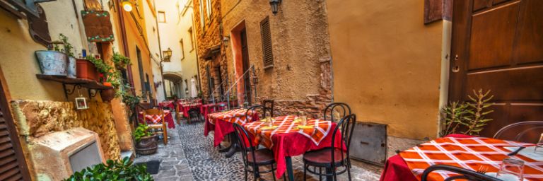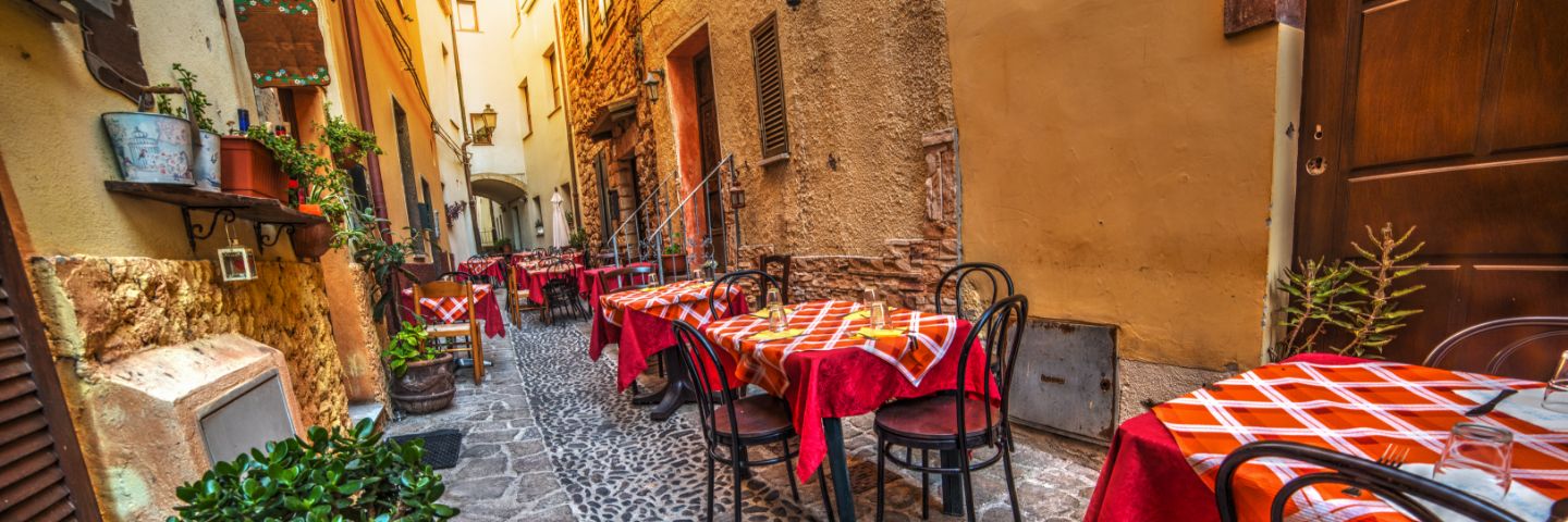 Rustic tables and chairs by a trattoria in Sardinia, Italy.