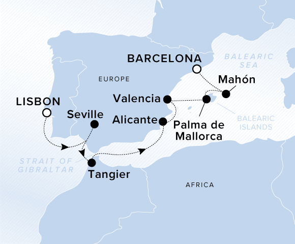 A map showing the Atlantic Ocean and Balearic Sea. A line shows the voyage route from Lisbon to Casablanca, Tangier, Seville, Alicante, Valencia and Barcelona.