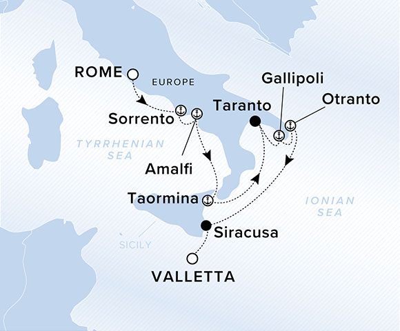 A map showing the Tyrrhenian Sea and Ionian Sea. A line shows the voyage route from Rome to Sorrento, Amalfi, Taranto, Gallipoli, Otranto, Siracusa, and Valletta.