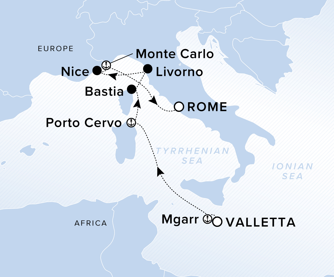 A map showing the Tyrrhenian Sea and Ionian Sea. A line shows the voyage route from Valletta to Mgarr, Porto Cervo, Batia, Livorno, Nice, Monte Carlo, and Rome.