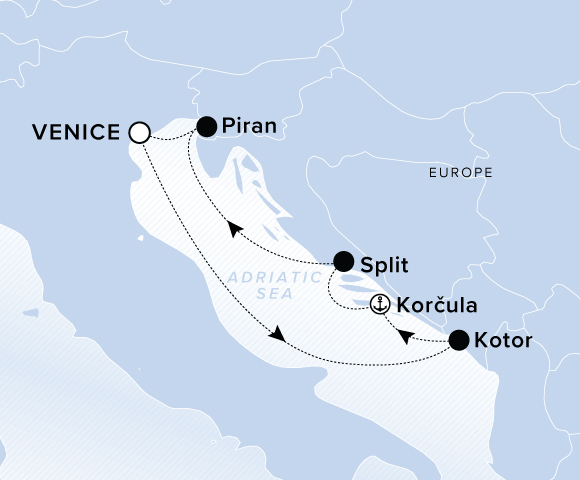 A map showing the Adriatic Sea. A line shows the voyage route from Venice to Kotor, korčula, Split, Koper, and Venice.