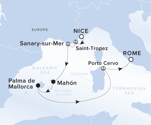 A map showing the Balearic Sea and Tyrrhenian Sea. A line shows the voyage route from Nice to Saint-Tropez, Sanary-sur-Mer, Mahón, Palma de Mallorca and Rome.