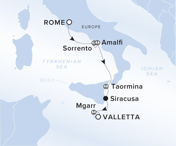 Multiple days in Sorrento, Sicily and Malta encourage leisurely exploration of these alluring destinations. Sip limoncello in Sorrento before sailing for the Amalfi Coast, so scenic and diverse that it is designated a UNESCO World Heritage site. Then compare the preserved ruins and majestic views from the Greek theaters of Taormina and Siracusa, before concluding with an overnight in the Maltese capital of Valletta.