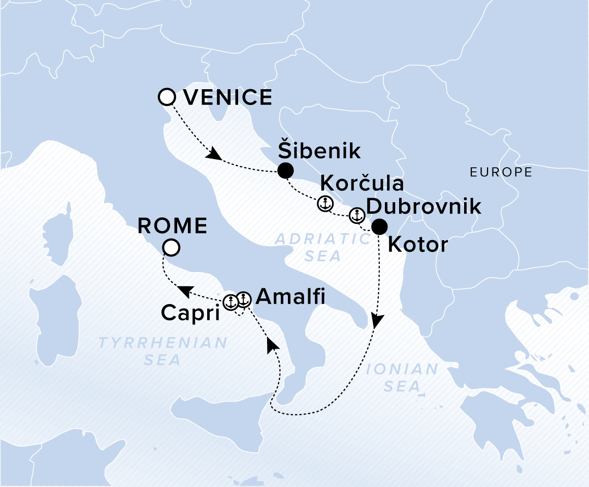 A map showing the Aegean Sea, Ionian Sea, and Tyrrhenian Sea. A line shows the voyage route from Venice to Šibenik, korčula, Dubrovnik, Kotor, Amalfi, Capri, and Rome.