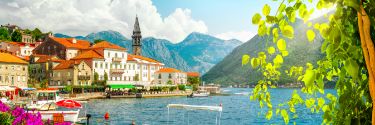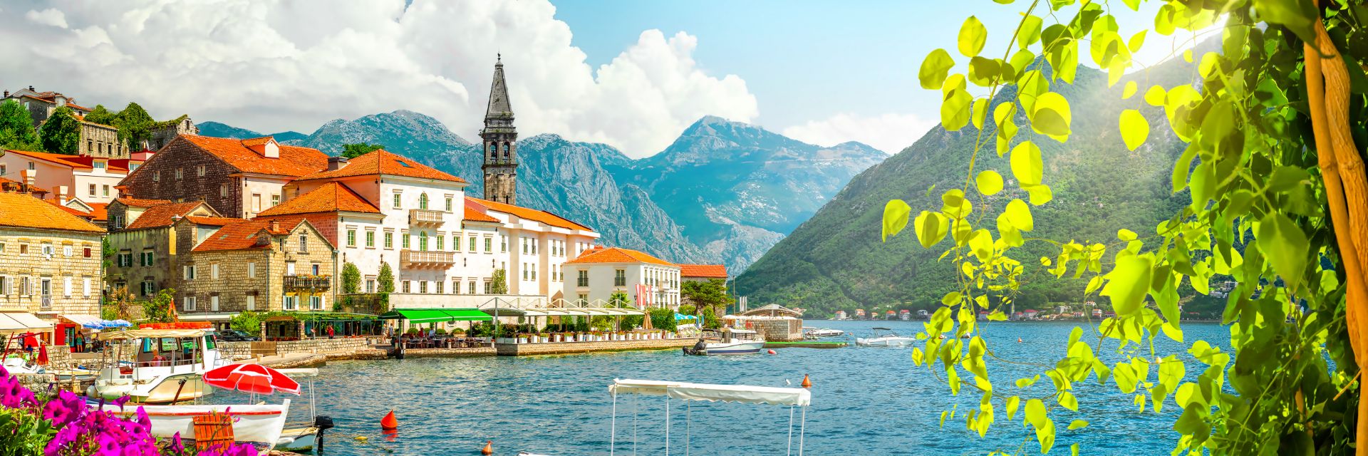 A small town on the shore of the Mediterranean, with mountains behind it, and bright pink flowers.