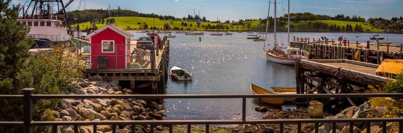 The view from a small bridge looking at boats docked in the blue water with green hills in the background.