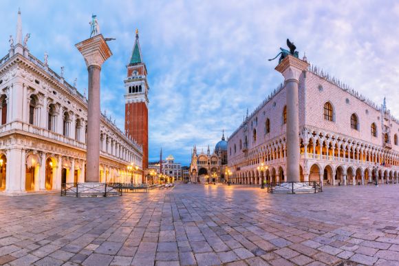 A panoramic view of Piazza San Marco, including the Column of San Teodoro, National Library, Doge's Palace and St. Mark's Basilica.
