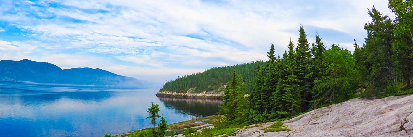 Lush green trees line the coast of deep blue water under a blue sky.