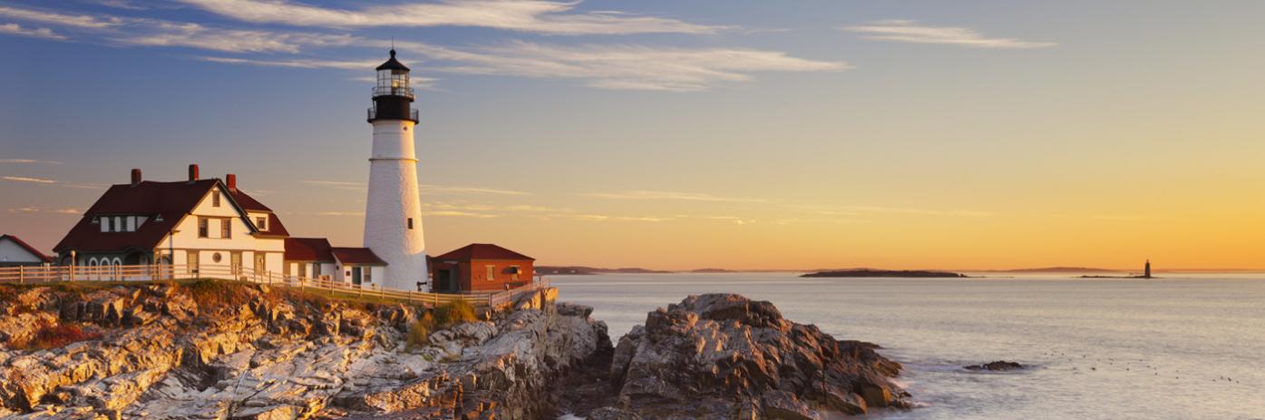 A lighthouse overlooks the rocky coast of Portland Maine at sunset