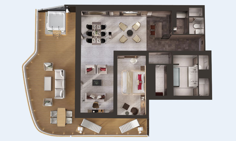 A floor plan of the Owner's Suite. A large wrap around terrace on the left, with plunge pool and deck furniture. Inside there is a living and dining room, bedroom, two large bathrooms, leading to the entrance on the right.