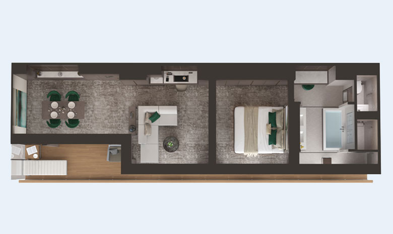 Floor plan of the View Suite. A long terrace runs along the length of the suite, a dining table and chairs, living room with couch and desk, bedroom and large bathroom with bathtub, shower and toilet.