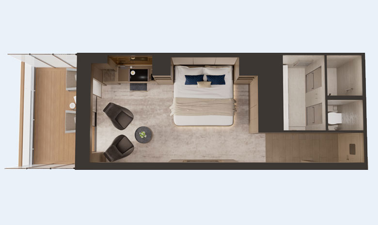 An image of the terrace suite includes a private outdoor terrace that overlooks the ocean. Inside the suite is a sitting area with two chairs, adjacent to the bed. The suite also includes a full bathroom with separate vanity, shower and toilet areas.