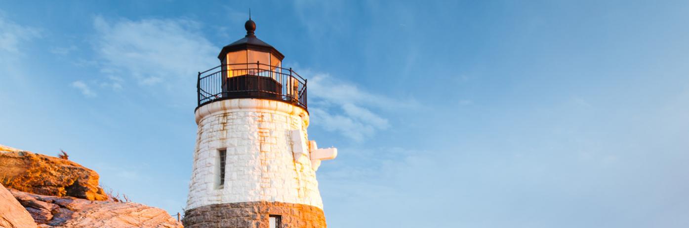 A lighthouse stands prominently on the edge of a rocky hill in Newport, Rhode Island