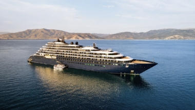Join just 298 guests aboard Evrima, taking in the view from your suite’s private terrace as you drop anchor off a scenic shoreline.
