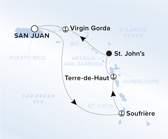 After a relaxing sail from San Juan, get your blood pumping with a rainforest hike in St. Lucia’s twin peaks, the UNESCO-protected Pitons. Then set off to find your favorite beach on the palm-shaded shores of Terre-de-Haut, the secluded stretches of sand on Antigua, and the boulder-laden grottoes of Virgin Gorda.