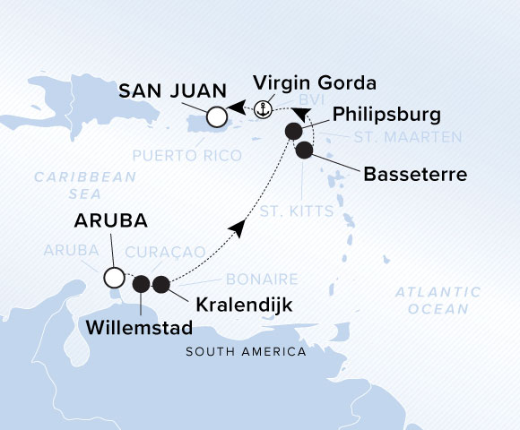Embarking in the southern Caribbean, explore the natural beauty of Aruba, Bonaire and CuraƧao by land and by sea, from world-class golf courses and wildlife sanctuaries to snorkeling and windsurfing. Sailing north, discover the secluded coves of St. Kitts, the chic boutiques of St. Maarten, and the hiking trails along the mountains and beaches of Virgin Gorda.