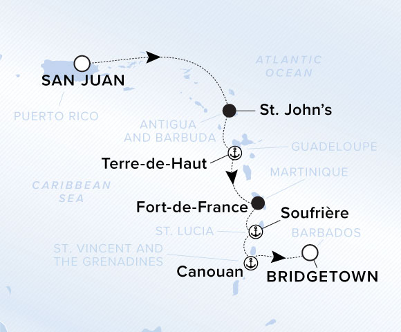 Explore Antigua Naval Dockyard – an 18th-century British maritime hub and UNESCO World Heritage site – before sailing for a trio of isles with French-Creole panache. France’s influence is evident in the cuisine of Guadeloupe, the fortresses of Martinique, and a former colonial estate in Soufrière, where you’ll find nature trails, waterfalls, mineral baths and botanical gardens.