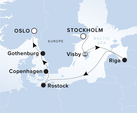 Known as the City of Roses, Visby is vaunted by UNESCO as the best-preserved medieval walled city in Northern Europe, while Riga is filled with outstanding art nouveau architecture, also protected by UNESCO. After exploring these intriguing Old Towns, sail for a trio of cosmopolitan capitals: Berlin – not far from the port of Rostock – followed by Copenhagen and Oslo.