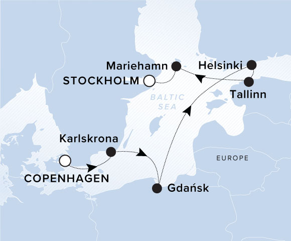 A map of the Baltic Sea with a line starting in Copenhagen going to Karlskrona, Gdansk, Helsinki, Tallinn, Mariehamn and ending in Stockholm.