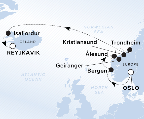 A map of Norway and Iceland. A line starting in Oslo going to Bergen, Alesund, Geiranger, Trondheim, Kristiansund, Isafjordur and ending in Reykjavik.