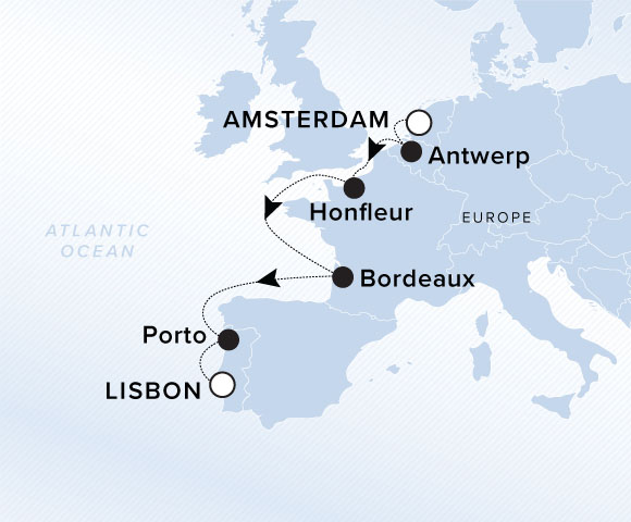 A map of Western Europe with a line starting in Amsterdam and going to Antwerp, Honfluer, Bordeaux, Porto and ending in Lisbon.