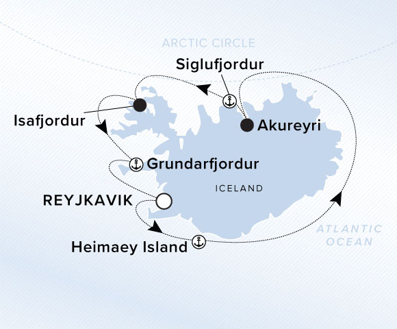 A map of Iceland with a line starting in Reykjavik and going eastward to Heimaey Island, then sailing the Arctic Circle to Akureyri. The line continues westward to Siglufjordur, then Isafjordur, Grundarfjordur and ends back in Reykjavik.