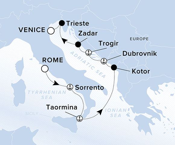 A map showing the Adriatic Sea, Ionian Sea and Tyrrhenian Sea. A line shows the voyage route starting from Rome going to Sorrento, Taormina, Kotor, Dubrovnik, Trogil, Zadar, Trieste and ends in Venice.