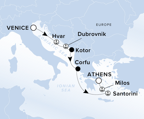 A map showing the Adriatic Sea and Ionian Sea. A line shows the voyage route starting from Venice and going to Hvar, Dubrovnik, Kotor, Corfu, Santorini, Milos and ends in Athens.