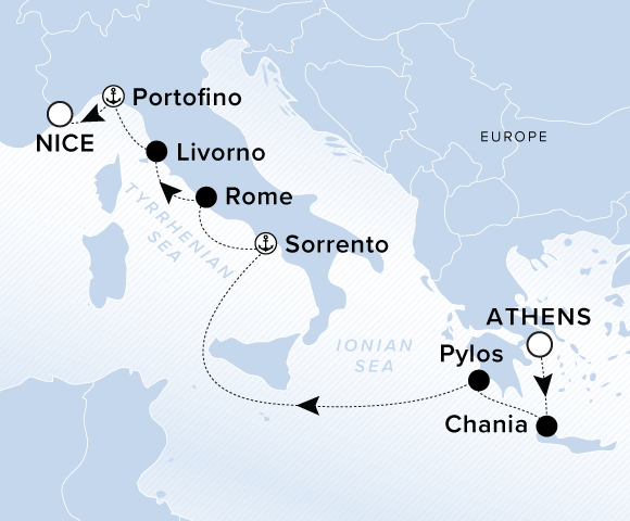 A map of the Ionian and Tyrrhenian Sea with a line starting in Athens and going to Chania, Pylos, Sorrento, Rome, Livorno, Portofino and ending in Nice.