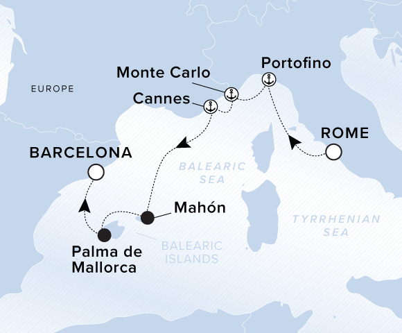 A map of the Tyrrhenian and Balearic Sea. A line starting in Rome going to Portofino, Monte Carlo, Cannes, Mahon, Palma de Mallorca and ending in Barcelona.